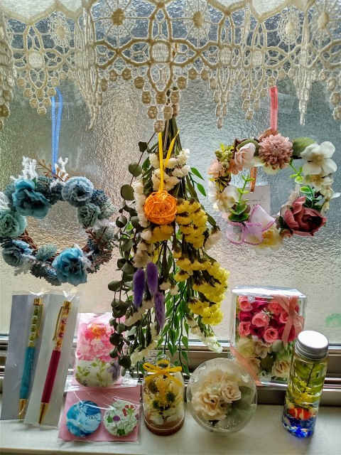 ①・ボトルフラワー500円 ・フラワーボールペン500円 ・フレーム作り1000円 ②・リース、スワッグ、フラワークラフトなど700円~2,000円 |