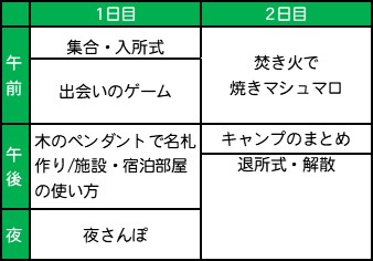 ・キャンプ中に発熱(平熱+1℃以上)があった場合や病気、怪我、体調不良などでキャンプ継続が不可能と判断された場合、自然の家までお迎えに来ていただく場合があります。(緊急時除く)