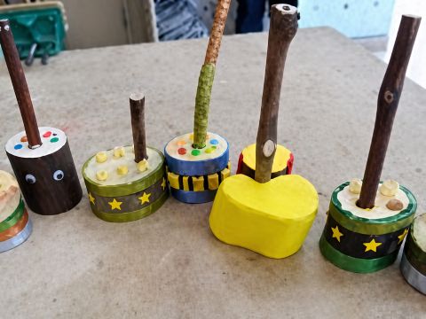 ノコギリで木を切り、ドリルを使ってえんぴつが入る穴を開けます。まわりを飾り付けて、オリジナルのえんぴつ立てを作ります。 | |