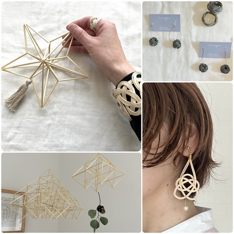 フィンランド発祥の光のモビール、ヒンメリと自然素材の籐アクセサリー販売。1,000円〜3,000円程度 |
