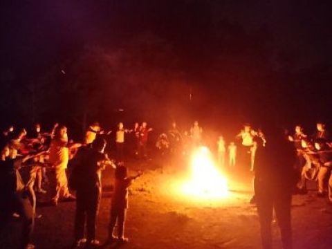 大きな火を囲み、夜の生きものたちの声をバックミュージックにレクリエーションゲームなどを楽しみます。にぎやかなひとときを過ごしましょう。(荒天時:室内レク・ゲーム) | |