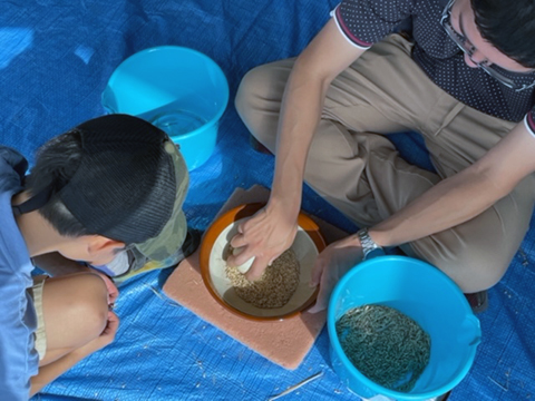 自然の家で育てたものを収穫したり、新たに畑を耕し種や苗を植えたりする家族で楽しく過ごすプログラムです。 所内の作物の生育状況に応じて収穫を体験します。春には稲を植え、秋には、刈り取った稲を脱穀して、籾摺り、精米し、ポン菓子づくりの工程を学びます。内容に応じて好きな時期に申し込みできます。