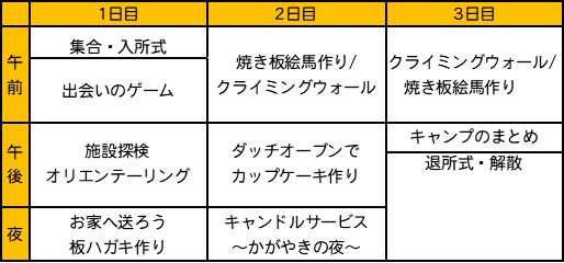 子どもたち同士の交流を深めることを目指したプログラムです。はじめて出会った仲間たちと異年齢グループ(縦割り)で活動します。仲間と助け合い生活をする2泊3日の経験は子どもたちの大きな自信を育てます。