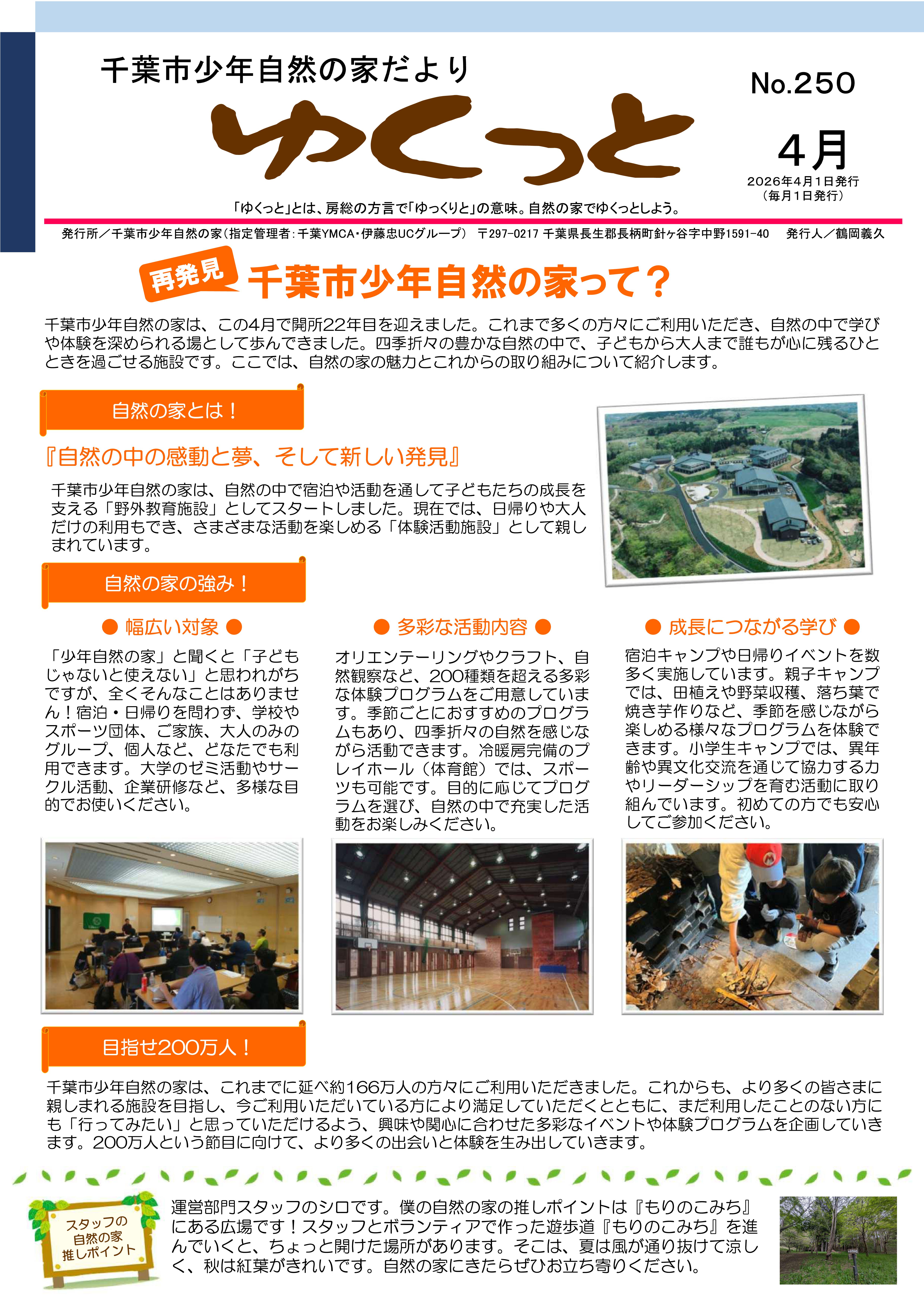 千葉市少年自然の家だより「ゆくっと」は、毎月1日に発行している自然の家の所報です。自然の家での出来事の報告や、今後のイベントの情報など、自然の家の旬な情報が盛りだくさんの内容となっています。